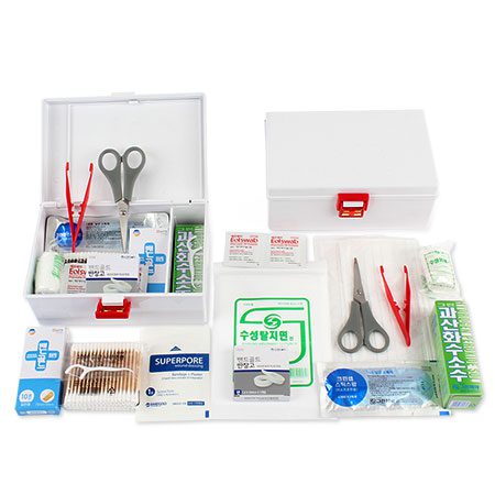 - 밴드세트, 면봉세트, 과산화수소 등 총 15종의 필수 응급 용품 포함.