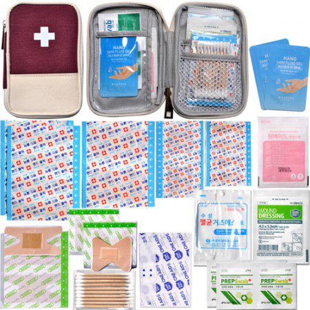- 반창고, 밴드, 소독 패드, 지혈용 거즈, 면봉, 핀셋 등 필수 응급처치 도구 포함.